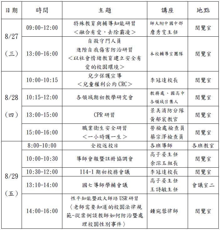 本校訂於8/27-29舉行期初教師共備研習,請全體教職同仁務必參加,時間及場次資訊如下: