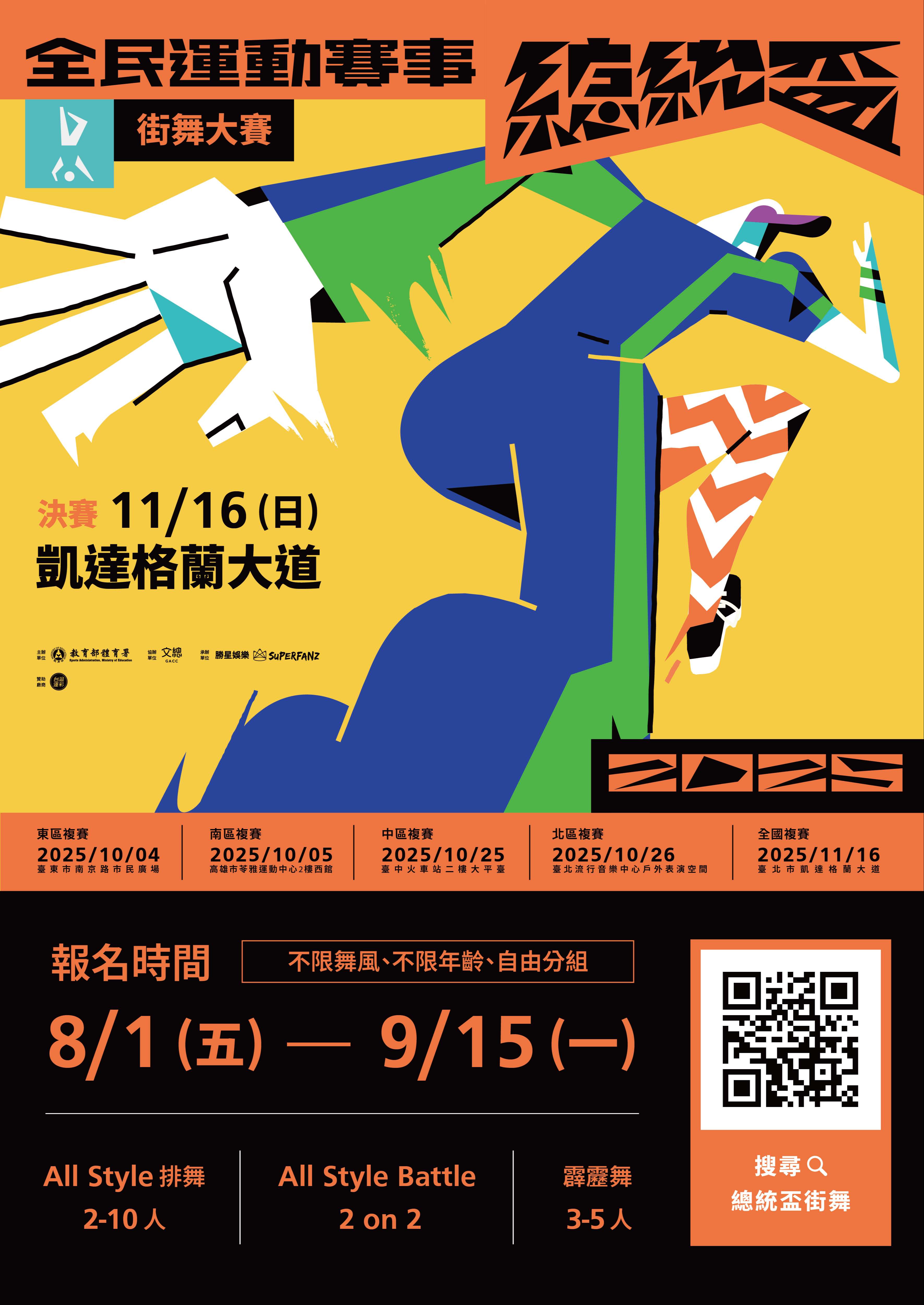 一、為配合運動部掛牌成立,推展全民運動、競技運動全民化政策及擴大推廣街舞文化,本署首度舉辦「2025 總統盃全民運動賽事—街舞大賽」,本賽事採全國性競賽形式,分為線上海選、四區實體複賽及總決賽三階段,共同角逐街舞最高榮譽。
