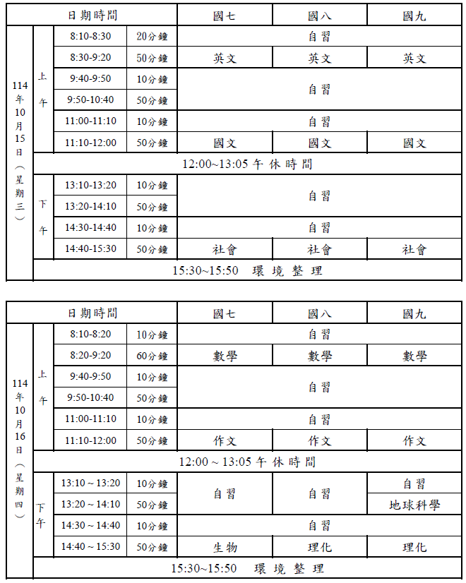 一、114年10/15(三)、10/16(四)為本校國中部114學年度第1學期第1次定期評量,考試日程表與考試範圍詳如附件,請參閱。