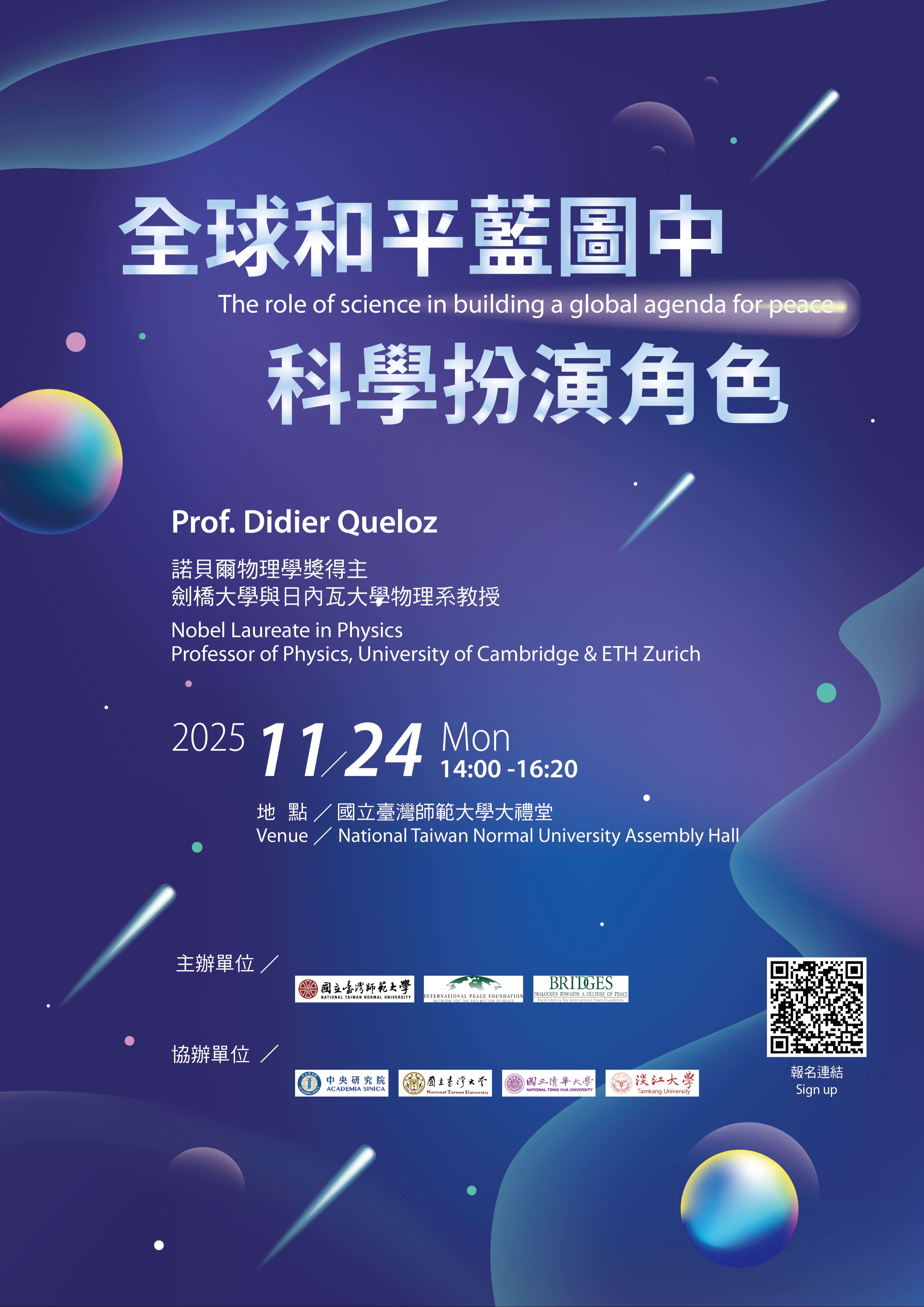 主旨:國立臺灣師範大學擬訂於今(114)年11月24日(星期一),於本校校 本部舉辦「諾貝爾物理學獎得主Didier Queloz教授講座」,敬請公告周知,並鼓勵貴校師生踴躍參與,請查 照。