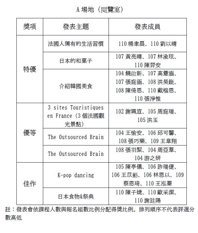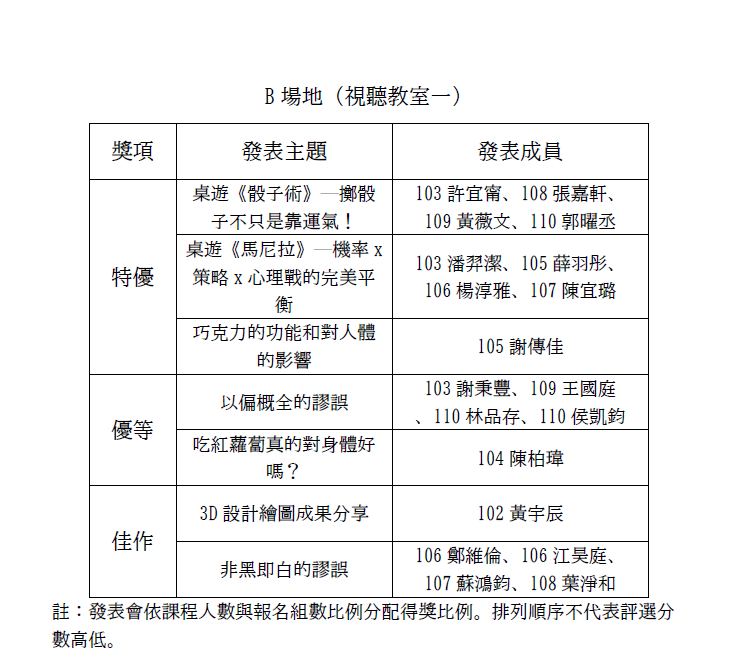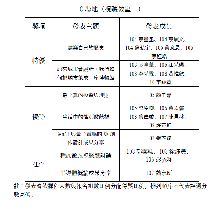 公告各場地分組發表會得獎名單,恭喜得獎同學!