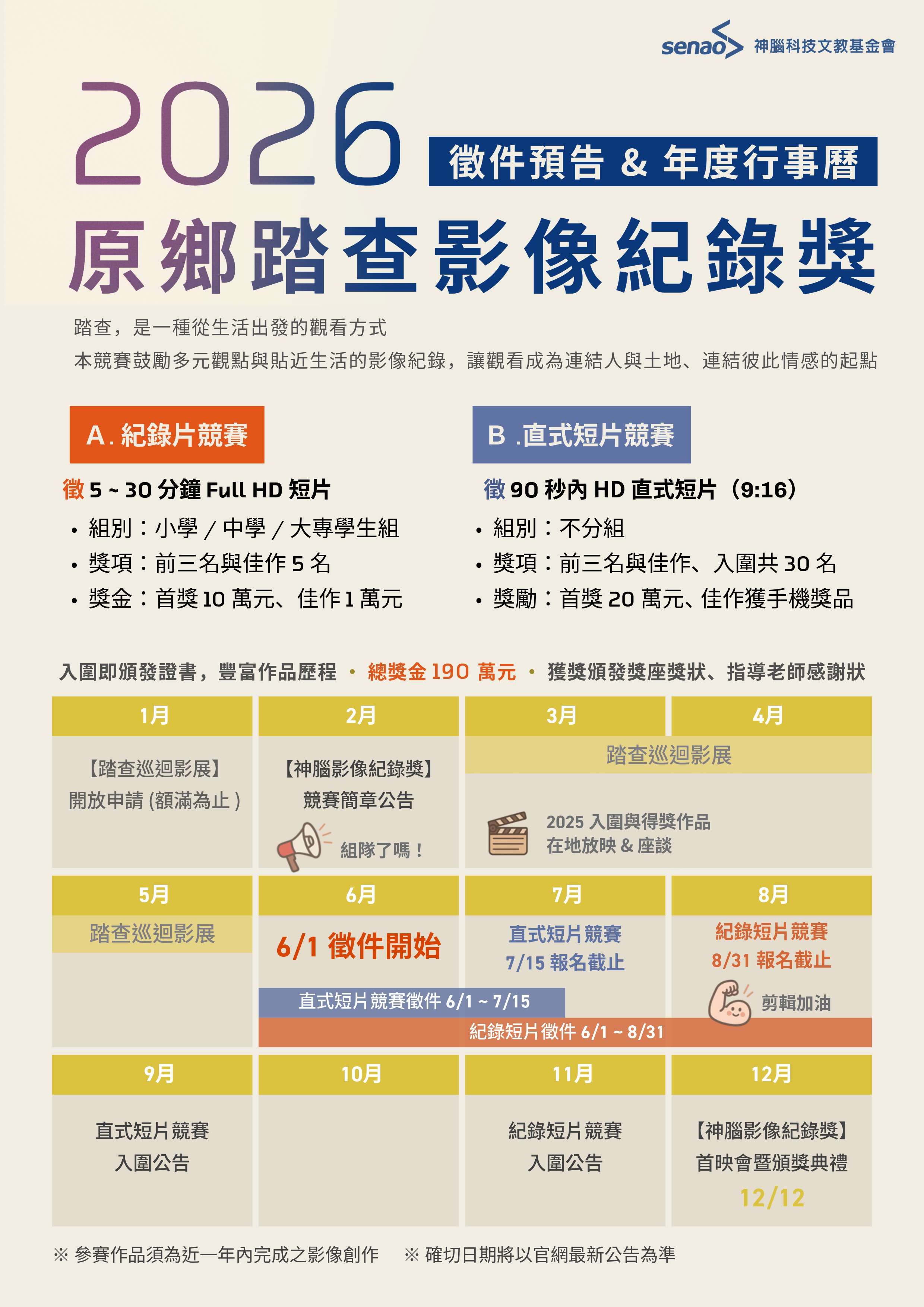 五、另本會預計於 115 年 6 月 1 日起辦理「2026 神腦原鄉 踏查影像紀錄獎」徵件。本屆徵件包含: