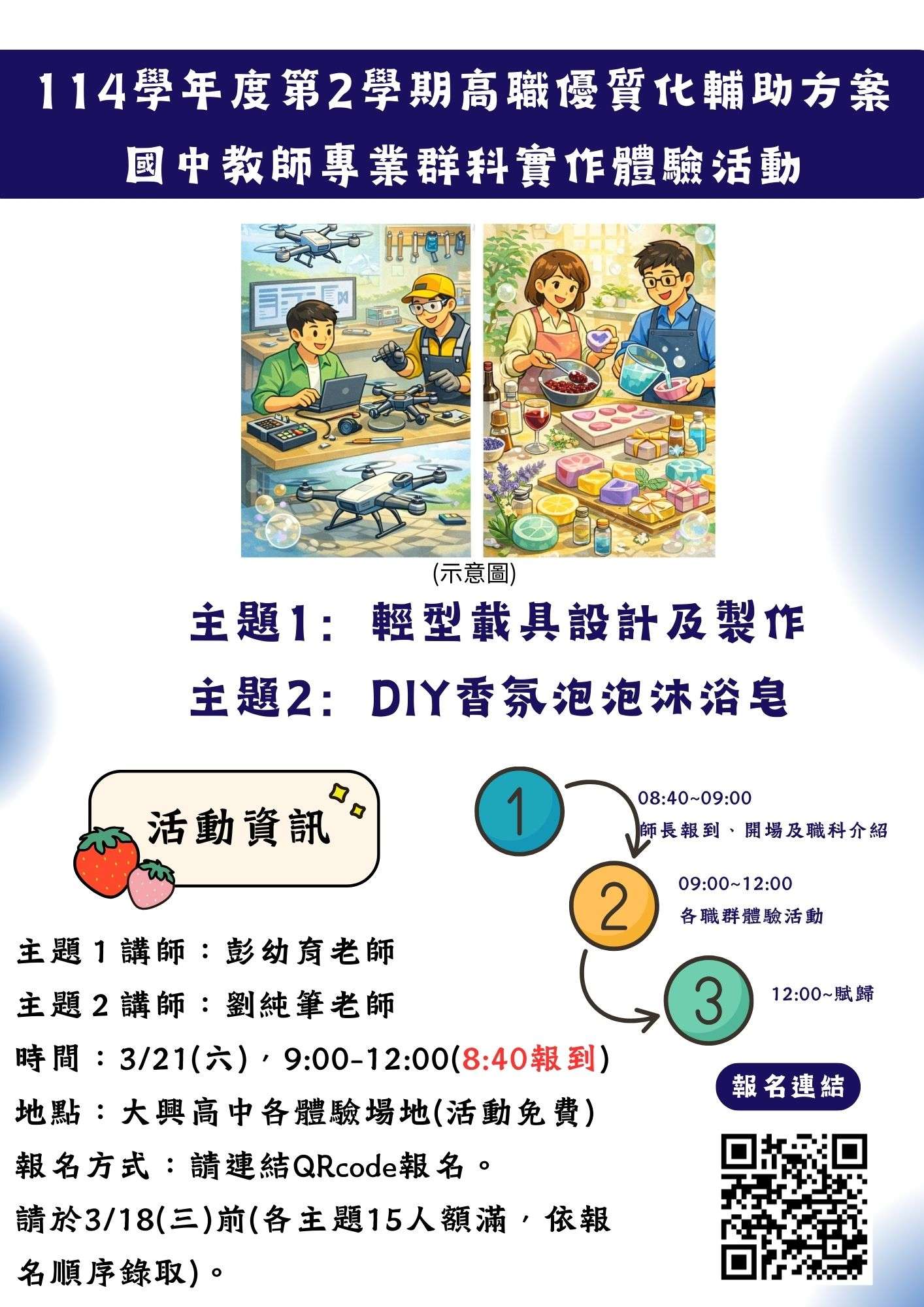 說明: 一、依據114學年度第2學期高職優質化輔助方案114-3展現技職 課程特色-114-3-2辦理國中教師專業群科實作體驗計畫辦 理。 二、活動時間: (一) 報到時間:115年3月21日(六)08:40。 (二) 實作體驗:115年3月21日(六)09:00~12:00,共3小 時。 三、主持人:周仁尹校長。 四、活動地點:本校大興樓3樓(飛機修護科)、髮藝教室(時尚造 型科)(桃園市大園區永興路142號)。 五、活動對象:各國中教師。 六、活動講師:本校飛機修護科彭幼育老師、時尚造型科劉純筆老師。 七、活動內容:動力機械群-主題:輕型載具設計及製作。家政 群-主題:DIY香氛泡泡沐浴皂。 八、報名方式:本活動全程免費,採線上報名,擇一報名。報 名截止日期為3/18(三)(飛修15人額滿、時尚15人額滿), 額滿為止 。 九、報名網址:https://forms.gle/uBF8qxp2sSqukpfF9。 十、本案聯絡人:本校實驗研究組組長顏嘉宏,電話:(03) 3862330分機13。
