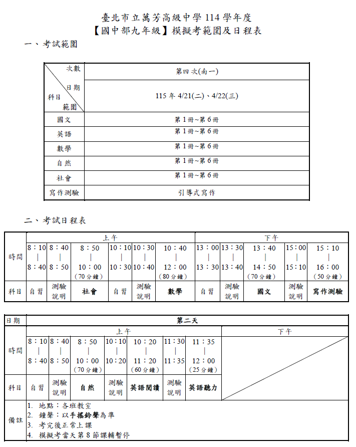 115年4/21(二)、4/22(三)為國中部九年級第4次模擬考,考試範圍及考程,詳如附件。