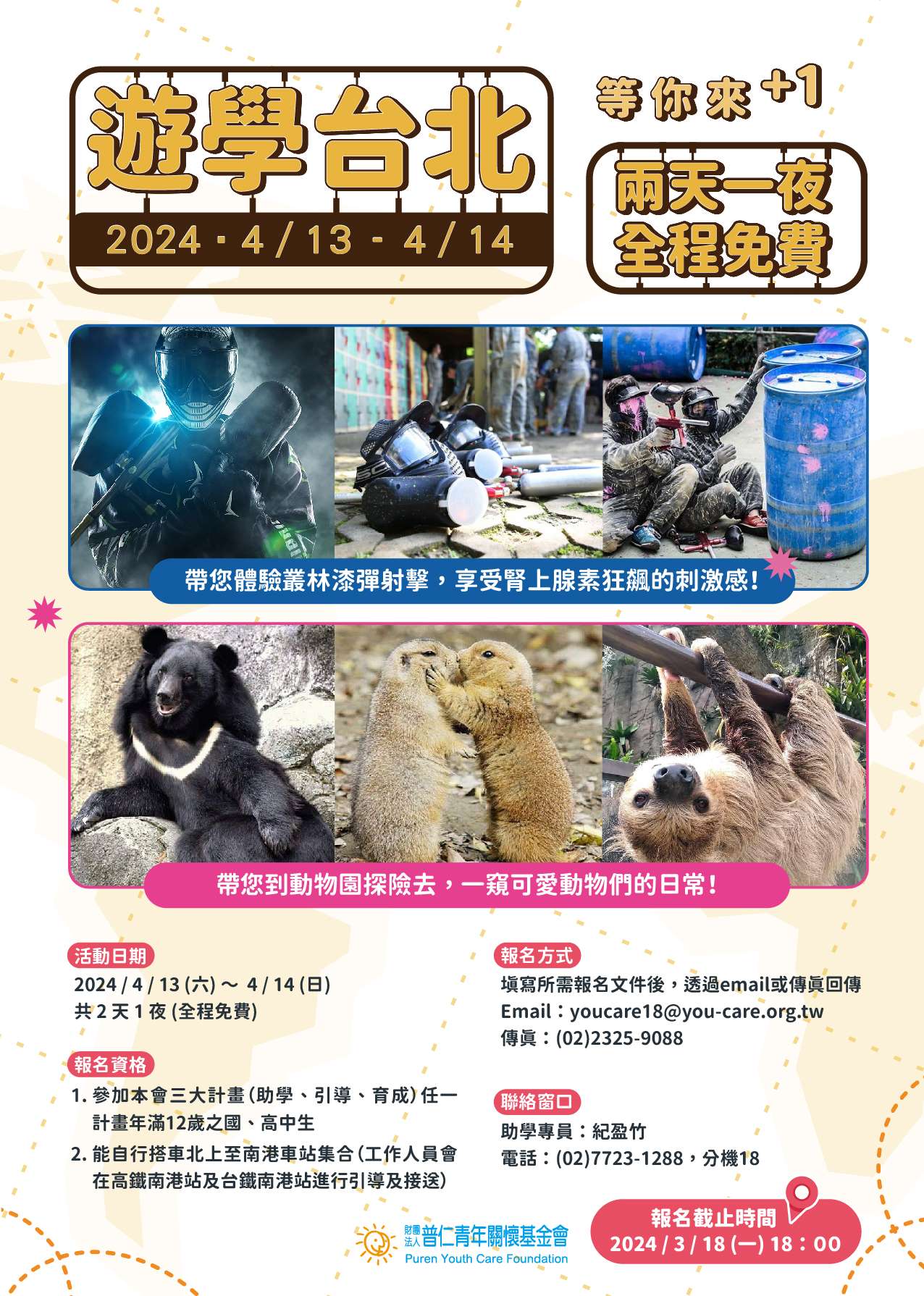 一、普仁青年關懷基金會將於2024年04月13日(六)至04月14日(日),舉辦2024年遊學台北青少年體驗活動,費用全免,凡參與普仁青年關懷基金會助學計畫、引導計畫或育成計畫之國、高中生皆可報名。(含 2024年7月開始受助學生)