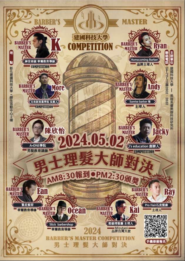 六、詳細活動時間、地點及議程等資訊可掃描QRcode或請至建國科技大學美容系網頁Barber`smastercompetition男士理髮大師對決(如附件)。