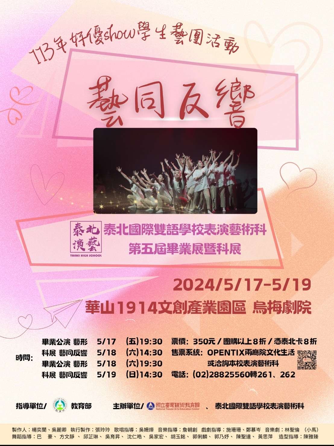 一、 泰北高級中學謹訂於113年5月17日(星期五)至5月19日(星期日) 舉行表演藝術科畢業展暨科展」主題分別為藝形與藝同反響,演出地點為「華山1914文創產業園區-烏梅劇院」。