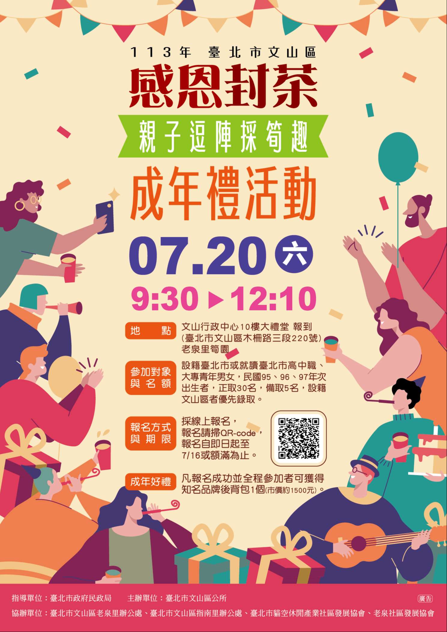 臺北市文山區公所113年成年禮活動 『感恩封茶,親子逗陣採筍趣』,將於113年7月20日(星 期六)上午9時30分至12時10分舉辦,歡迎民國95、96、97 年次出生且設籍臺北市或就讀臺北市高中職、大專青年男女參加。活動包含最受歡迎的封茶及採筍體驗,報名成功且全程參與還可以獲得知名品牌運動後背包喔!即日起開放報名,額滿為止,報名網址:https://forms.gle /2iT7TQPdJFmspcFw9,活動詳情請參閱活動文宣,洽詢電話(02)2936-5522分機356李小姐。