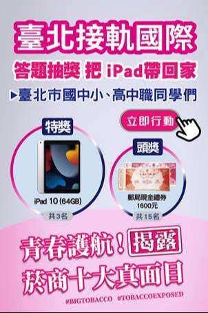 「臺北接軌國際~認清菸商真面目」答題抽獎活動,獎品豐富,踴躍參加。