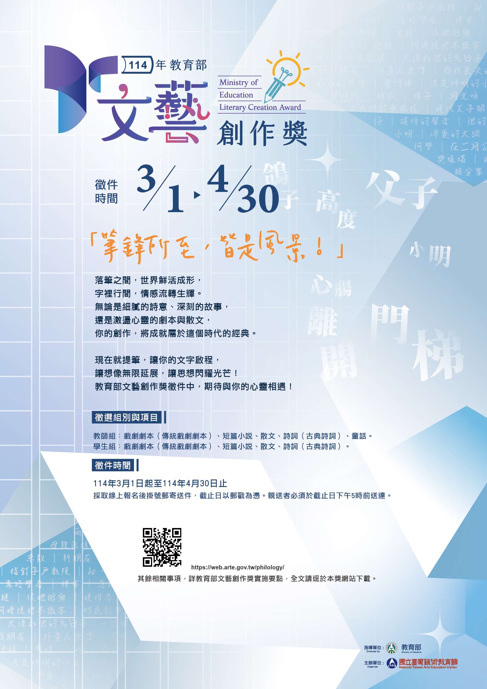 參選受理期間:自114年3月1日起至114年4月30日截止,採取先線上報名(網址:https://web.arte.gov.tw /philology/),後以掛號郵寄送件方式辦理,截止日以郵戳為憑;親送者必須於截止日下午5時前送達,實施要點及宣傳海報請參閱附件。