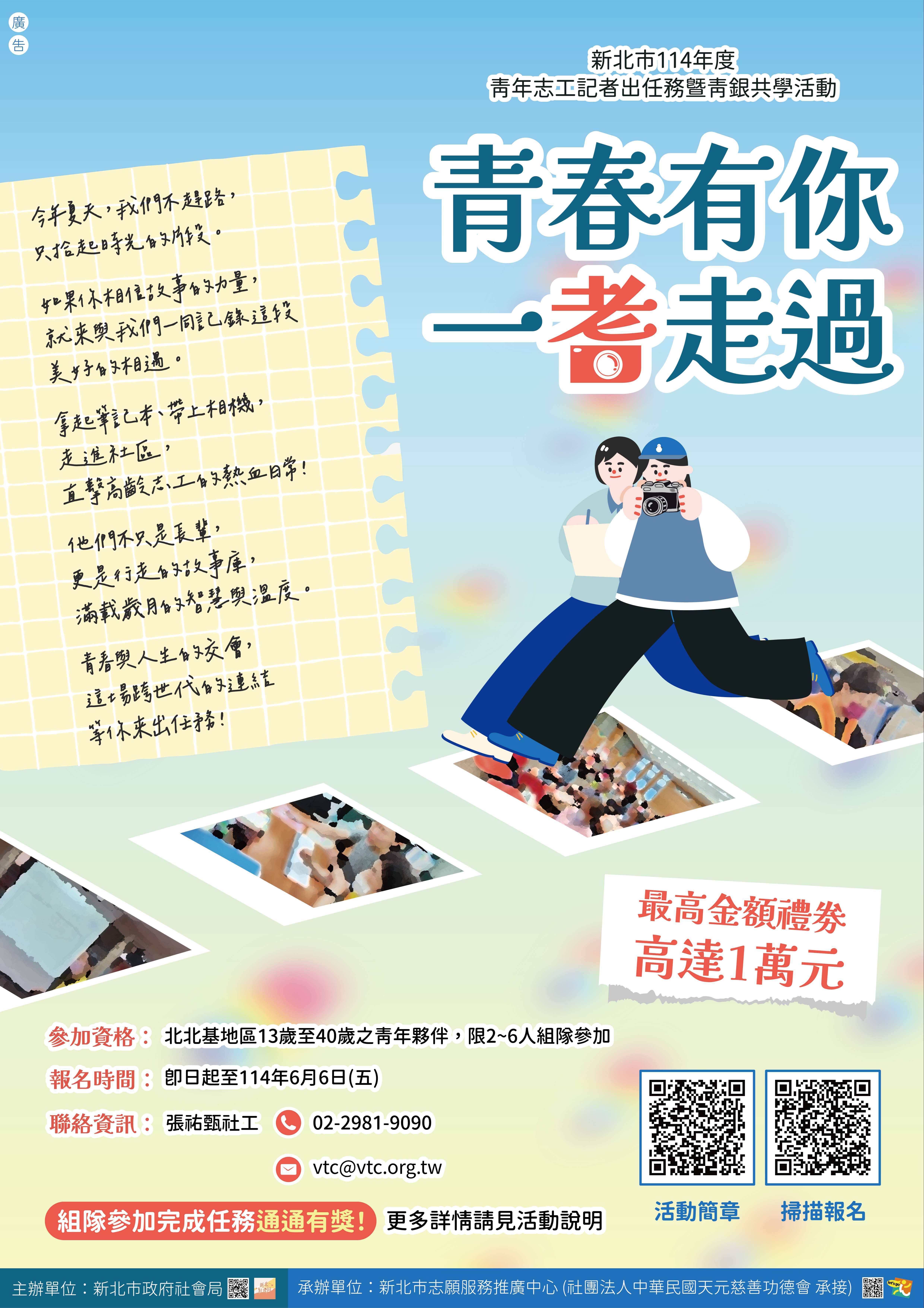 一、為鼓勵青年學生踴躍參與社會公益,新北市政府社會局委託新北市志願服務推廣中心於114年4至8月辦理旨揭活動。