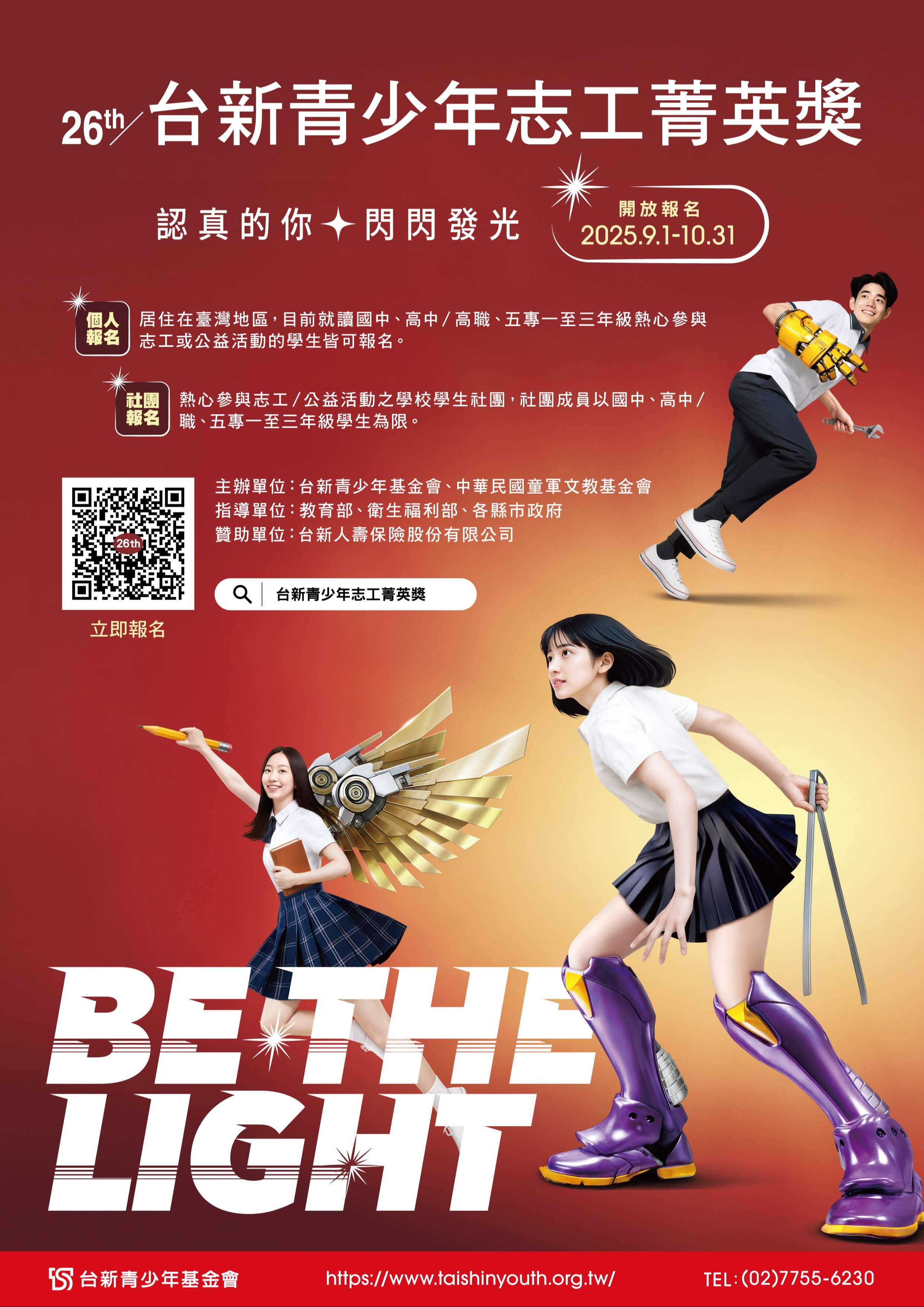 一、旨揭活動受理報名至114年10月31日止,獎項分為「個人服 務」、「社團服務」2項類別,相關報名資訊請逕至該活動網站查詢:https://www.taishinyouth.org.tw /2025apply,如有問題請洽活動專線(02-7755-6231)。